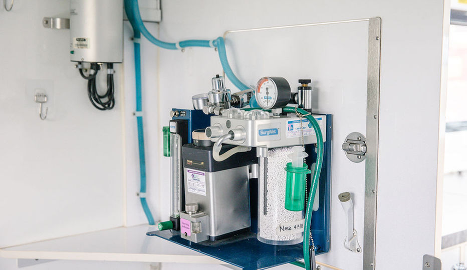 Inside, the clinic includes a dedicated exam room, full surgical suite, wet table for dentals, sink, radiology brackets, and animal holding compartments. Medical-grade cabinetry, solid work surfaces, LED lighting, and an ergonomic layout support efficient, sanitary workflow. An anesthesia machine and active gas evacuation system are included.